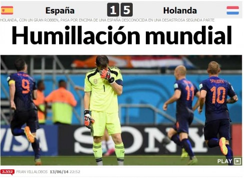 Η Ισπανία γνώρισε τη δεύτερη πιο βαριά ήττα της σε Μουντιάλ και ο Τύπος της χώρας κάνει λόγο για Παγκόσμιο εξευτελισμό. Οι πρωταθλητές κόσμου δεν μπορούσαν να πιστέψουν ότι δέχτηκαν 5 γκολ από τους Ολλανδούς και ο Τσάβι έκανε λόγο για τη χειρότερη ήττα της καριέρας του. Δείτε τα γκολ του αγώνα. Η ομάδα που για μία εξαετία κυριάρχησε απόλυτα σε ευρωπαϊκό και παγκόσμιο επίπεδο έγινε σάκος του μποξ για τα παιδιά του Λουίς Φαν Χάαλ.......